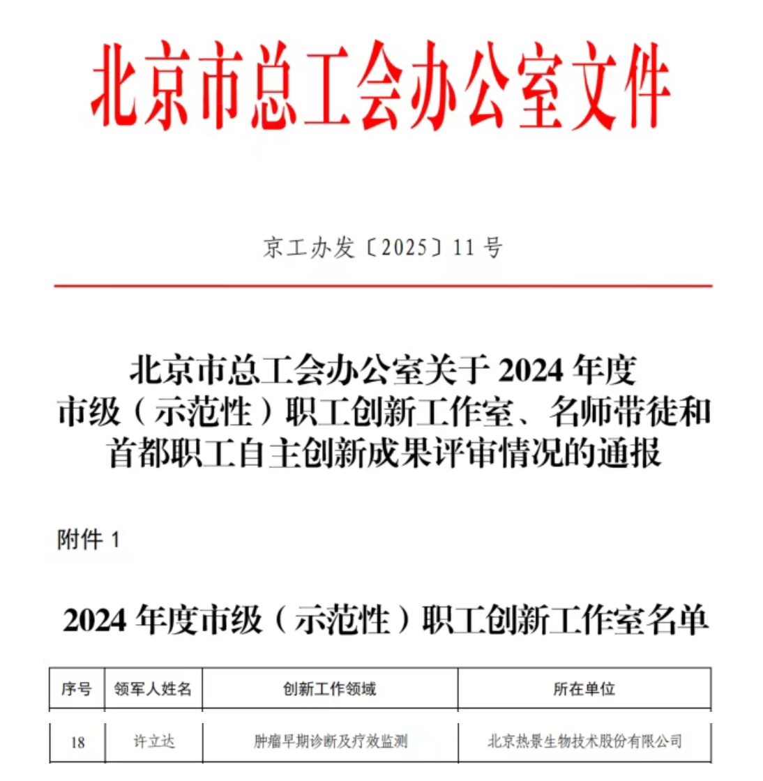 近日,北京市總工會發(fā)布《關于2024年度市級(示范性)職工創(chuàng)新工作室、名師帶徒和首都職工自主創(chuàng)新成果評審情況的通報》,熱景生物許立達研究員領軍的“腫瘤早期診斷及療效監(jiān)測”創(chuàng)新團隊榮獲“北京市級職工創(chuàng)新工作室”稱號,該稱號是對工作室在腫瘤精準診斷領域持續(xù)創(chuàng)新與技術轉化卓越貢獻的權威認可。創(chuàng)新驅動腫瘤診斷革新該工作室專注于腫瘤早期診斷與療效監(jiān)測技術的研發(fā),依托公司核心原創(chuàng)技術,成功搭建起獨具特色的多組學診斷技術平臺,實現(xiàn)外泌體、蛋白、核酸等腫瘤標志物從發(fā)現(xiàn)到臨床轉化的貫通,助力腫瘤精準診療。