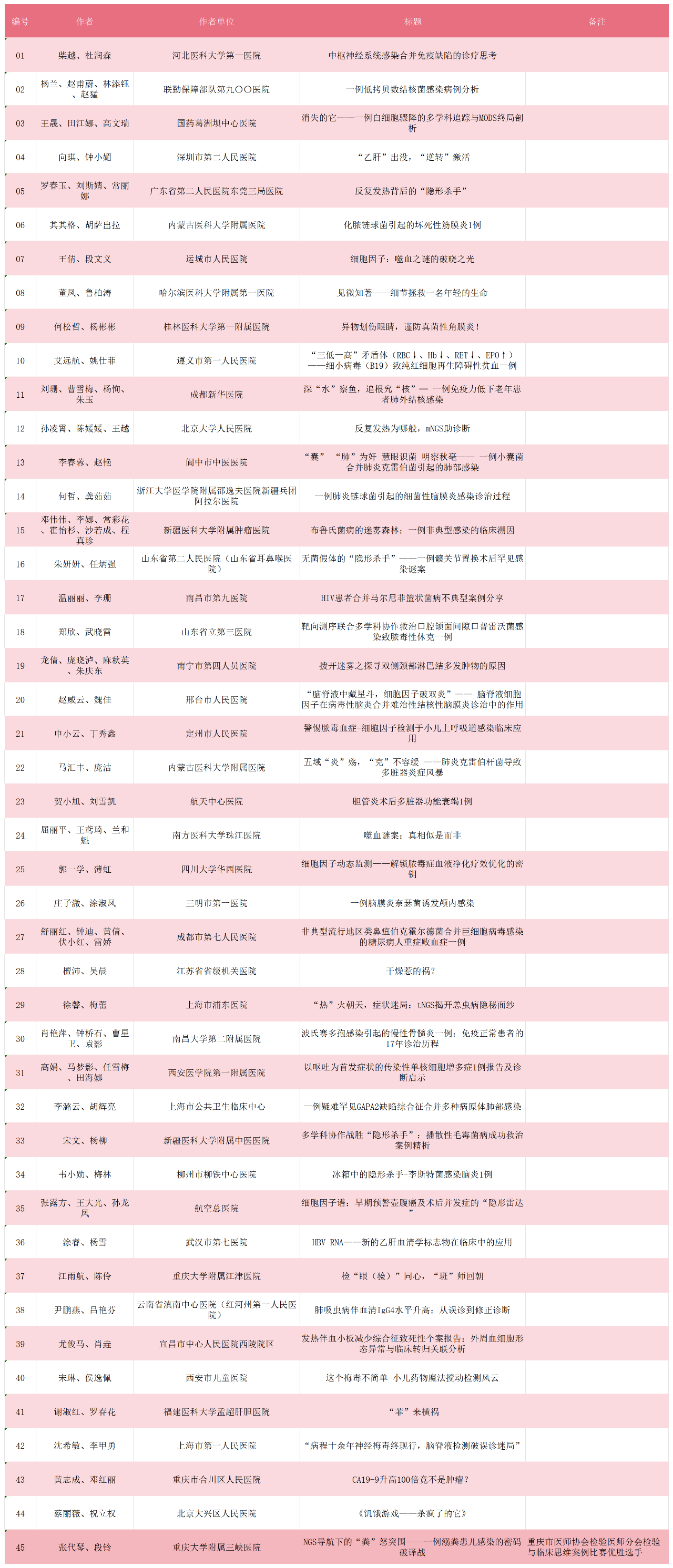 為了有效推動檢驗與臨床的深度融合,進一步提升檢驗人員的臨床思維能力,在中華醫(yī)學會檢驗醫(yī)學分會青年學組指導下,西部數(shù)智醫(yī)療研究院、《檢驗醫(yī)學》雜志、檢驗醫(yī)學新媒體主辦,白求恩精神研究會檢驗醫(yī)學分會細胞因子與疾病檢測學組、北京熱景生物技術股份有限公司協(xié)辦的「第五屆檢驗與臨床(感染性疾病)思維案例展示活動」已全面啟動。在面向全國進行征稿,并對稿件進行雙盲雙審(同一篇稿件均由2位專家進行評審)后,根據(jù)評審結果,共納入復審稿件45篇。以下為詳細名單,排名不分先后。